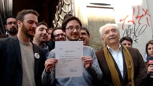 Inscripción de la candidatura de Francisco Figueroa en el Servel en Santiago. Algunas de las personas presentes en la foto son Jaime Parada, Francisco Figueroa, Jorge Arrate, Andrés Fielbaum y Gonzalo Martner.